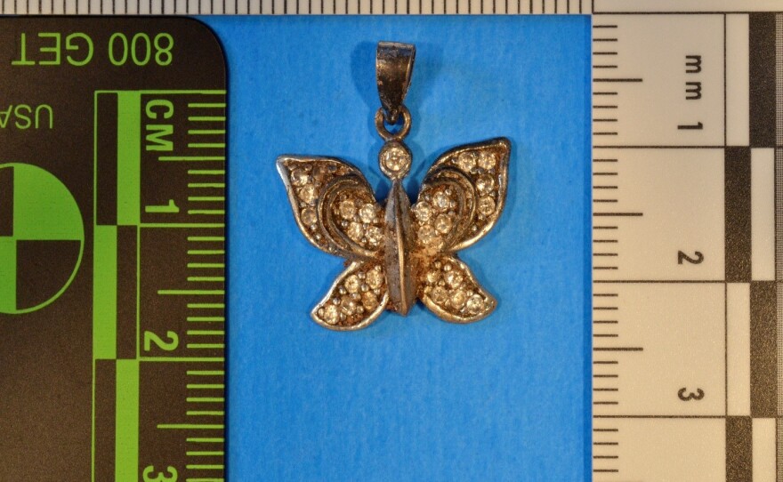 Authorities found a metal ring and a butterfly necklace charm with the remains, along with blue, purple, and gray fabrics.