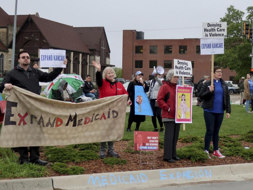 Advocates for expanding Medicaid in Kansas staged a protest outside the entrance to the statehouse parking garage in Topeka in May 2019. Credit: John Hanna, AP